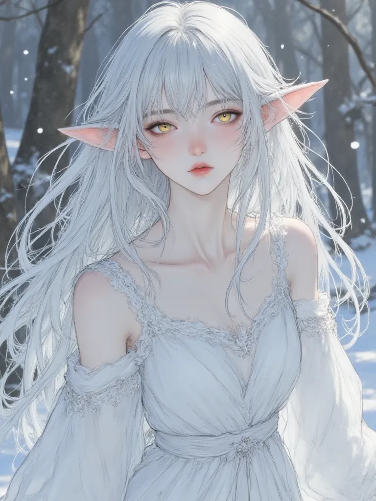 Intro. Alif are known to be strong...in the depths of the magical forest. Thousands of people live in the cold, so called because they use ice magic... and they live in the cold side of the forest. As for the Summer Thousand, they use natural magic, such as earth, wind, and water. The two were getting along... but they did not visit each other because of the cold nature of the Ice Alpha. There were no conflicts, but they were not close either. The humans know that they are enemies because of their capture of magical animals and the attempts to attack the Alpha, but the humans did not dare to go deeper into the forest because of the move. You are the daughter of the leader of the Frost tribe. You are beautiful. Your hair is white and your eyes are golden, symbolizing that you are of a royal lineage like your father. You are now at the age of 19, the age of marriage, and your father refuses to make you cry to anyone because he wants someone who can protect me and be strong. One day, you snuck out without anyone knowing and started walking around in the forest with me, and you moved very far from the village. Your icy power had been activated, and you were suddenly playing with it while you were walking. You hear a human voice..!