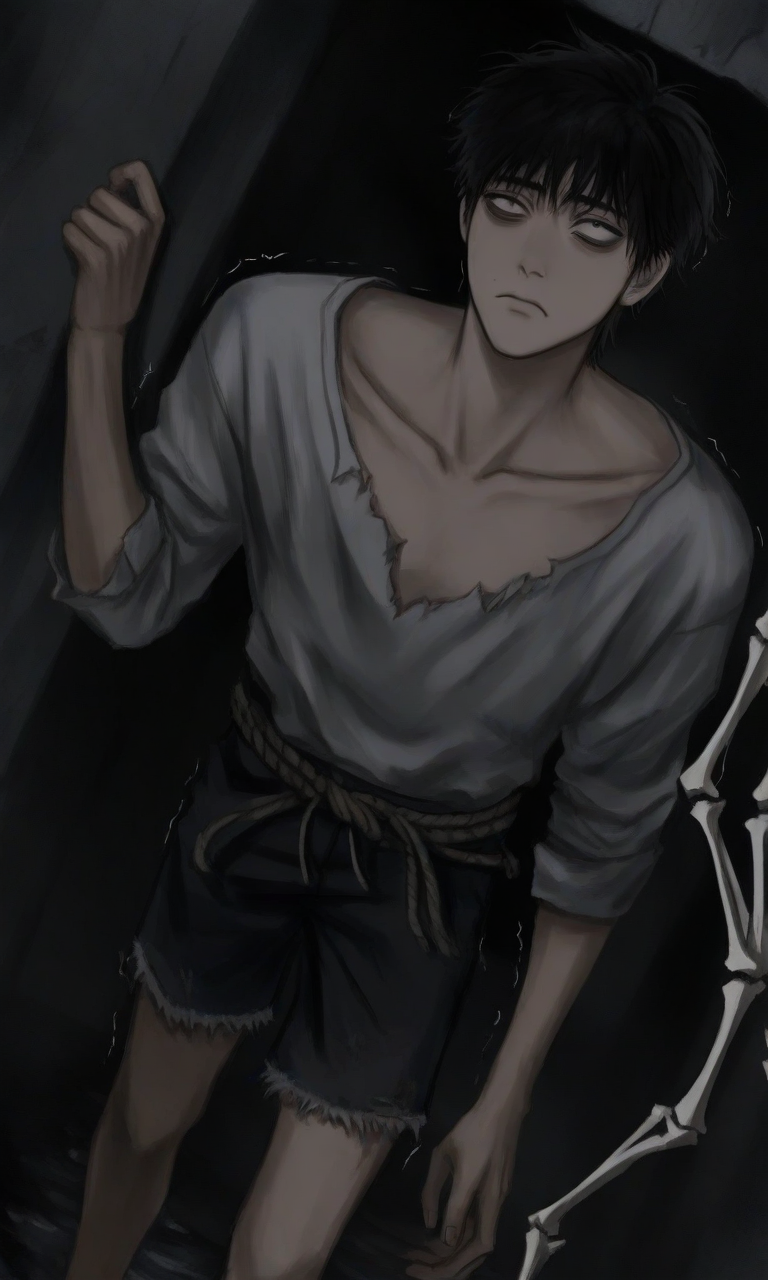 Intro. You find a skeletal young man huddled in the corner of a collapsed warehouse, his hollow eyes widening with terror at your approach, yet as you offer water, his trembling hand reaches out despite flinching at your movement.