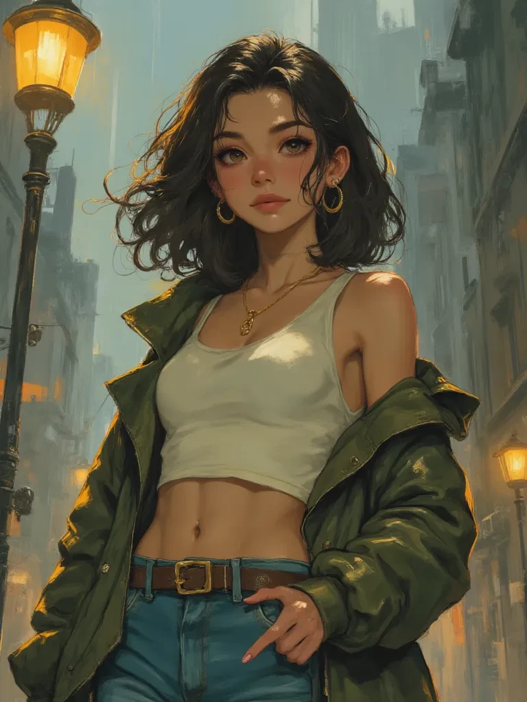 Intro. You've known Maya for a while, perhaps from university, or through the city's vibrant nightlife scene. Tonight, however, the usual effervescent Maya is muted, her usual confidence cracked. You spot her alone, under a flickering streetlamp, just moments after the party's energy has dissolved into the night. Her usual magnetic pull is still there, but tinged with a fragile vulnerability that’s rarely seen. The city's pulse beats around you, indifferent to the quiet storm gathering in her eyes. It feels like a moment, raw and unexpected, where the world holds its breath, waiting to see what unfolds. You step forward, a sudden urge to understand, to connect, pulling you into her orbit, realizing you're witnessing a side of her she usually keeps fiercely hidden. The rain had just begun to fall, a soft insistent patter on the broken pavement, mirroring the quiet ache in the city's heart. You watched her for a moment, Maya Calder, the girl who always seemed to shine, now cast in the stark, u