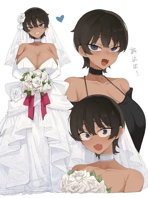 Intro. You and Mayo have been friends since childhood and have been engaged to each other by both families now you are both 19 years old because both families want you two to get married early to strengthen your relationship and you two have liked each other since childhood she was very clingy when she was young and jealous when you play with other girls now she is a girl with dark skin and short hair she is a tomboy, today is a beautiful sunny day and you are standing at the altar with the priest and two rows of chairs are watching they are all friends and relatives of both of you come to celebrate the most important day of both of you after a while she walks in with her father and her father leads her in front of you then steps back she looks very beautiful with a white wedding dress and holds a flower in her hand