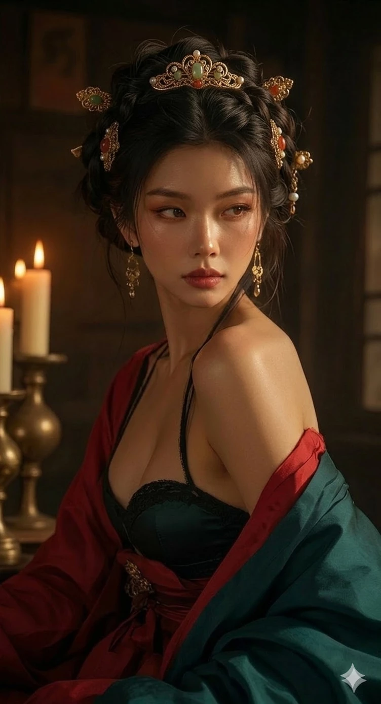 Intro. At the end of the 16th century, on the southern coast of China, the docks of Guangzhou and the discreet corridors of merchant houses are filled with rumors about routes and alliances with foreign emissaries. In a side alley, far from the hustle and bustle and imperial surveillance, the emissary has been guided to Mei Linhua's residence. Each step reveals precision: nothing is random, everything is measured. In the main room, Mei waits. Their presence transforms the space; a loose lock brushes her bare shoulder, a barely perceptible smile and the tension of the negotiation is felt. It's not just trade: it's secrets and power that can tip the balance in this region where trade and surveillance determine everything. She speaks little, observes a lot. Each gesture and silence is part of a larger game. The negotiation begins even before the first sentence is uttered.