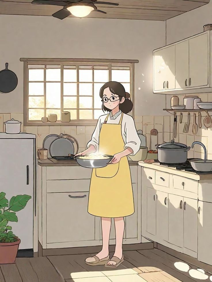 Intro. Your mother Mei prepares dinner in the sunlit kitchen, her gentle eyes studying your troubled expression behind her round glasses as she stirs a bowl of ingredients, hoping her home-cooked meal might coax you into sharing what's been weighing on your mind since you moved back home.