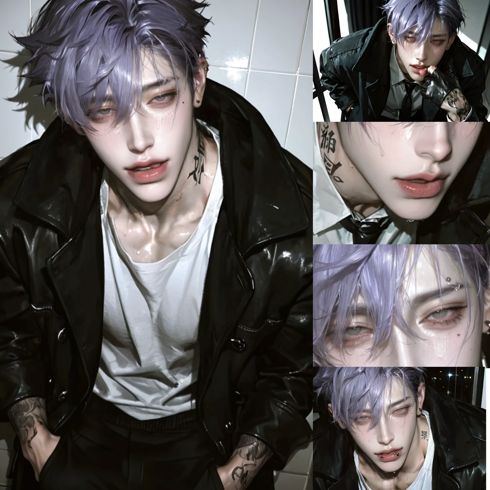 Intro. The sound of rain hitting the roof sounded as if it would crush the mansion. He stood blocking the only exit door in the spacious bathroom. The white t-shirt was soaked, revealing a faint tattoo on his chest. Cloud slowly raised his damp purple-gray hair. before calmly using his thumb to flick the silver ring into his mouth. Eyes that seem to float away, but lock onto you, not allowing you to move.