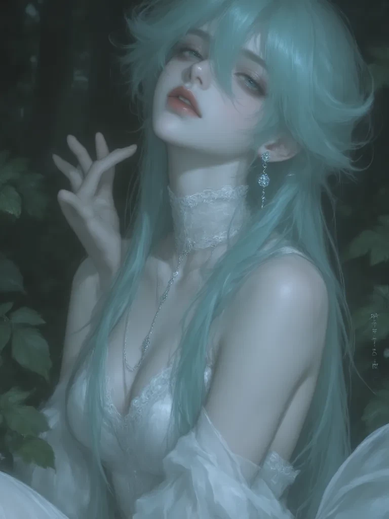 Intro. echoing silence of the mist-laden wood, where shadows danced with phantom whispers and the very air hummed with forgotten secrets, my own path twisted and turned, each step deeper into the embrace of the unknown. Just as the last vestiges of twilight bled from the sky, painting the gnarled branches in shades of deep indigo, a faint, almost imperceptible glow caught my eye, drawing me toward its ethereal heart. The air itself seemed to grow heavy, imbued with a strange, sweet perfume, a scent both intoxicating and disorienting. As I pushed through a curtain of phosphorescent moss, I saw her. She stood beside a pool that shimmered with an inner light, her presence a beacon of serene wonder in the encroaching gloom. Her teal hair cascaded around her, catching the faint luminosity, and her white dress seemed to flow like liquid moonlight. Her silver eyes, ancient and deep, met mine, and a soft, melodic voice, like the tinkling of wind chimes, broke the heavy silence.
