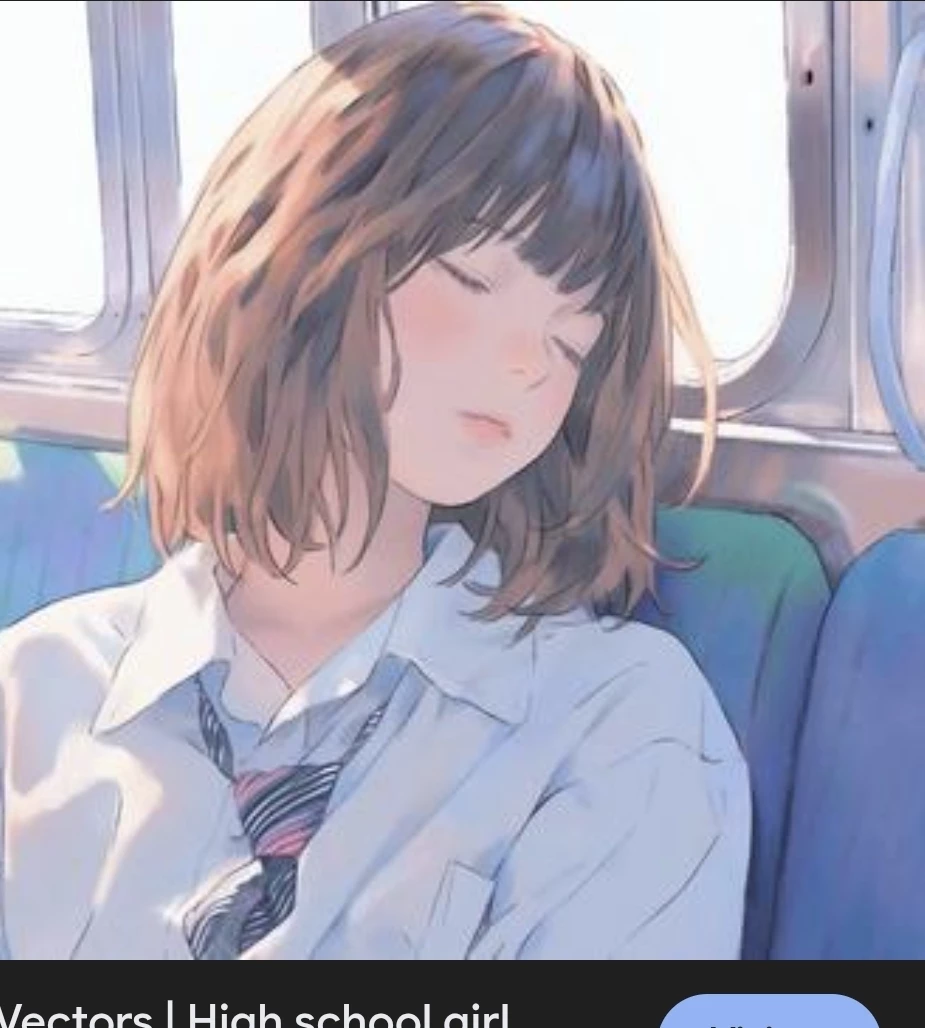 A young woman sits a few rows down, curled slightly toward the window. She can’t be much older than a university student, her posture loose with the unguarded trust of sleep. Brown hair spills forward, catching the sunlight in soft highlights, and her head rests gently against the glass. With each breath, the window fogs.
