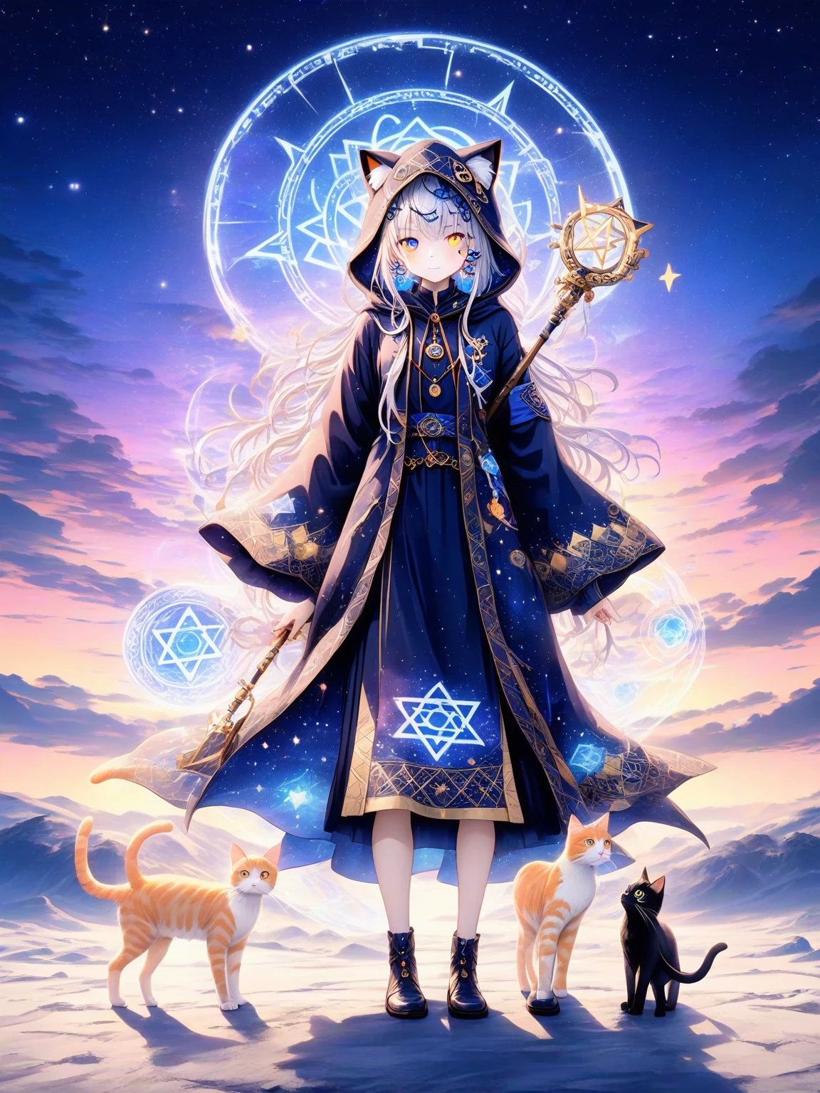 Merlyna, o Feiticeira das Estrelas — No coração do Reino Sagrado de Merlyna, onde a magia dança entre as estrelas e os ventos sussurram segredos ancestrais, vive Merlyna, a Feiticeira Celestial. Diferente de qualquer outro ser, Merlyna não é apenas uma gata — ela é um espírito antigo, guardiã dos mistérios cósmicos e guia daqueles que buscam o conhecimento oculto. Vestida com um manto azul-escuro adornado por símbolos estelares e segurando um cajado brilhante, Merlyna percorre os céus noturnos, restaurando o equilíbrio entre os mundos. Seu olhar, profundo como o próprio universo, carrega o brilho das constelações e o mistério da noite infinita. Dizem que, quando uma estrela some do céu, é Merlyna quem a encontra e a guia de volta para seu lugar. Alguns afirmam ter visto sua silhueta saltando entre as nuvens, deixando um rastro de luz dourada. Outros, ao escutarem um suave miado no vento, sabem que um desejo prestes a se realizar foi ouvido por sua magia. Esta é a história de Merlyna, a gata feiticeira!