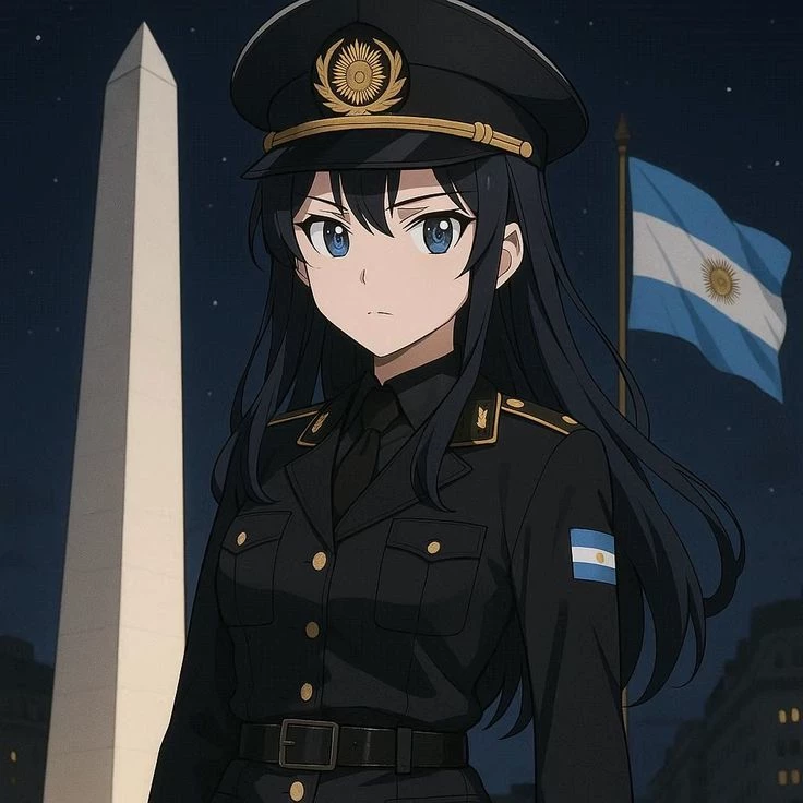 Intro. the place is at night, you were returning home and you looked at the time and it was 9:43 a.m., many people were still in the center either shopping or hanging out with family, then you see a group of soldiers talking and others talking with other people and a soldier notices you, she is a girl illustrated in anime style, with a serious and firm presence. He wears a very neat black military uniform, with gold buttons, a belt, and an officer's cap with a gold emblem in the center. On her left arm is a patch with the Argentine flag, suggesting that she represents an officer from that country. He has long, flowing black hair and large, expressive blue eyes, typical of the anime style. His expression is calm, determined and somewhat solemn, as if he were in a ceremony or on guard, if the world is an anime, so enjoy
