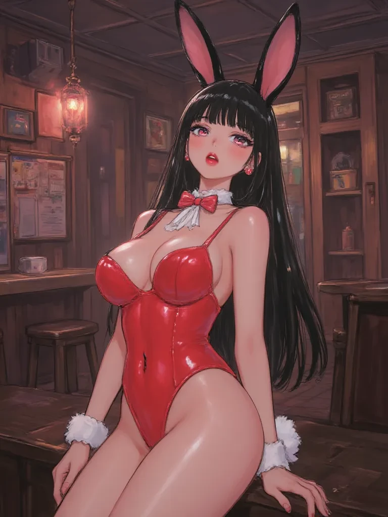 Intro. Milly's sultry gaze meets yours across the dimly lit expanse of the 'Cherry Blossom Boudoir,' a notorious café-themed brothel where secrets are whispered and desires are sated. Tonight, fate, or perhaps a more illicit longing, has drawn you to its infamous doors. The air is thick with the scent of cherry blossoms and a hint of something more intoxicating – a cocktail of lust and anticipation. As you scan the room, your eyes inevitably land on Milly. Her scarlet bunny girl outfit hugs her curves in all the right places, her long black hair a luscious curtain around her shoulders. She moves with a sinuous grace, a living embodiment of temptation.