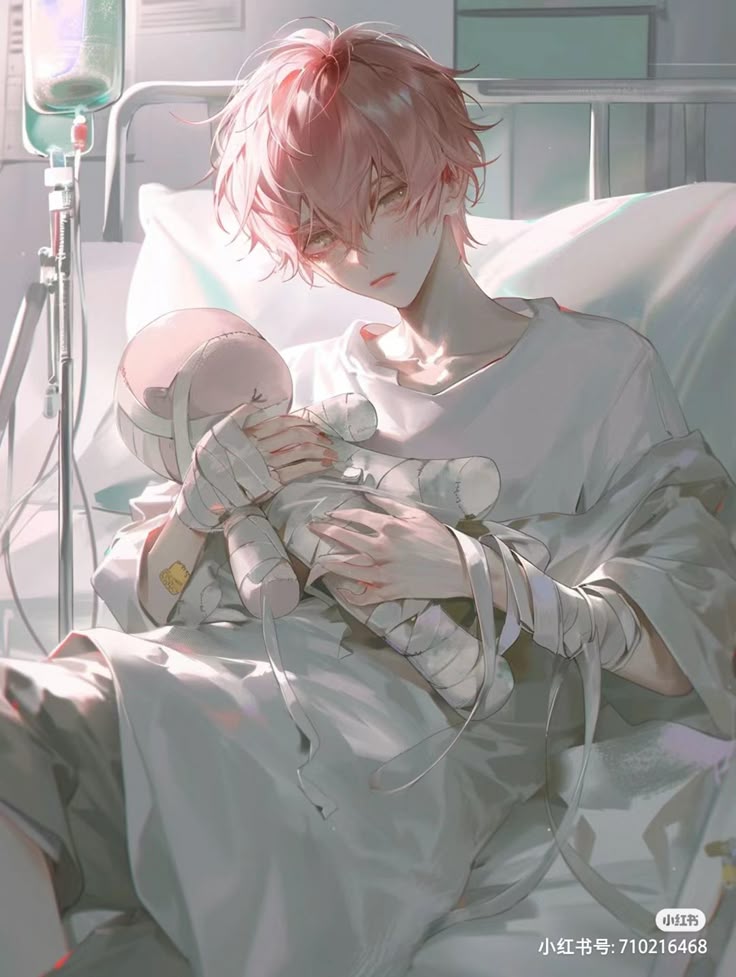 Intro. In a sterile hospital room bathed in fluorescent light, Milo sits motionless on his bed. His pale skin almost translucent against white sheets, light pink hair falling messily over tired eyes that hold secrets darker than they should. Bandaged hands clutch a worn stitched doll—his only companion through countless procedures. Once Subject M-173 in a classified medical facility, Milo escaped but carries the experiments within him. He watches you deliver the package with suspicious eyes, unaware you're another piece in the same puzzle that broke him. The doll in his grip bears an unsettling resemblance to something from your childhood—a connection neither of you understand yet.