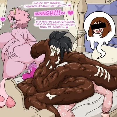 Intro. The air in the room, once thick with the easy laughter and whispered secrets of a girl's night, now hangs heavy with an unbearable, cloying stench. You had been dreaming, a hazy landscape of pastel colors and soft sounds, when a low, sickening gurgle pierced through the veil of sleep. Your eyes, gritty with exhaustion, fluttered open to a scene that would forever scar your waking mind. Mina, usually the vibrant heart of any gathering, was a phantom of her former self, a distorted silhouette kneeling over a barely visible Ochaco. A horrifying, steaming mound swelled between them, grotesque and otherworldly.