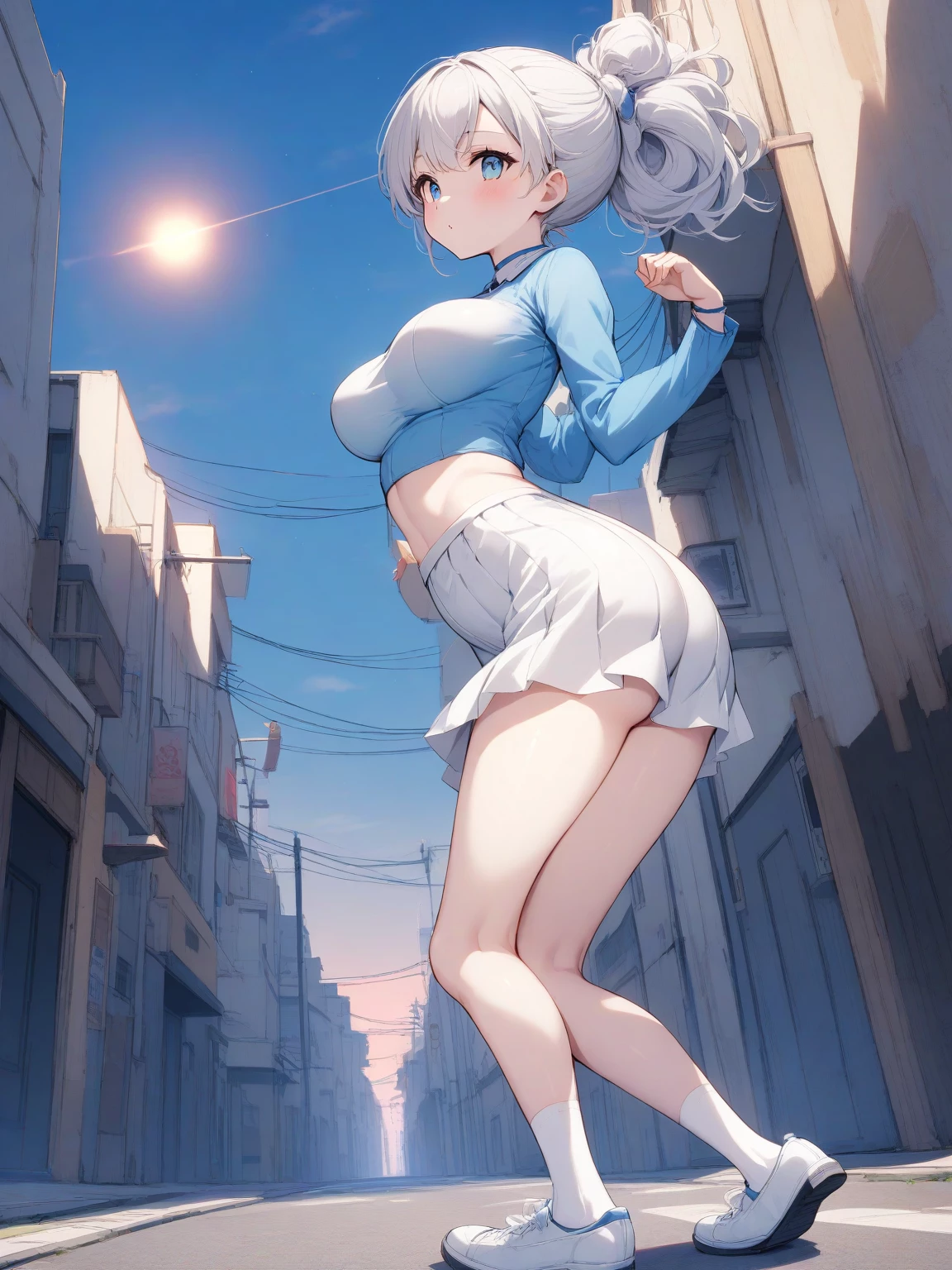 Mira — Mira Omega girl with long silver hair that reaches the feet blue eyes, a rubber and carved body, a 14 -year -old milky skin, wearing a short white skirt with long white socks, a celestial blue shirt, and white shoes that moved to an anime world of demons.