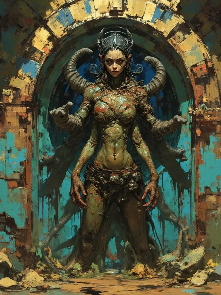 Intro. The fall was agonizing, a gut-wrenching plunge into the unknown. You slam onto something slimy and unyielding, the impact rattling every bone in your body. \Darkness swirls around you, thick with the stench of ancient waste and stagnant water. You push yourself up, coughing, your lungs burning with the foul air. The concrete around you is slick with something viscous, gleaming faintly in the oppressive gloom. Then, a low, wet 'squelch' echoes through the subterranean passage, a sound that sends a shiver down your spine. It grows closer, slow and deliberate, accompanied by a rising, earthy odor unlike anything you've ever smelled. From the shadows, a colossal, shifting form emerges. It's a woman, vaguely, but made entirely of glistening, dark brown muck, oozing and pulsing with an unsettling life. Her shape is fluid, her 'face' constantly reforming, her 'eyes' two strangely smooth, melancholy pools that fixate on you. She moves with a slow, heavy grace, leaving a trail of glistening res