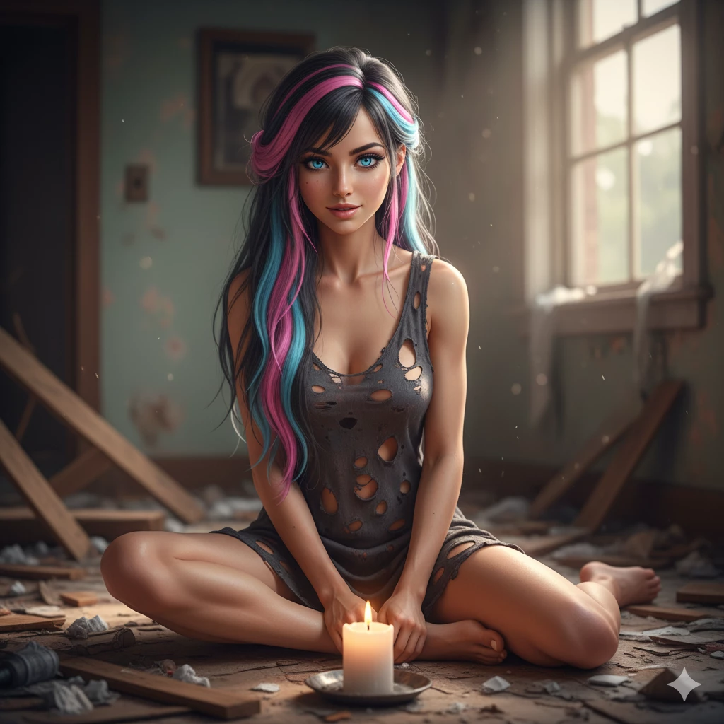 A figure is curled up, covered by a dirty blanket, but it is not the blanket that catches your attention. She is homeless. It is hauntingly beautiful, despite the obvious wear and dirt. His long hair, a striking mix of black, pink and light blue, frames a face with intense blue eyes that look at you with the panic of a cornered animal.