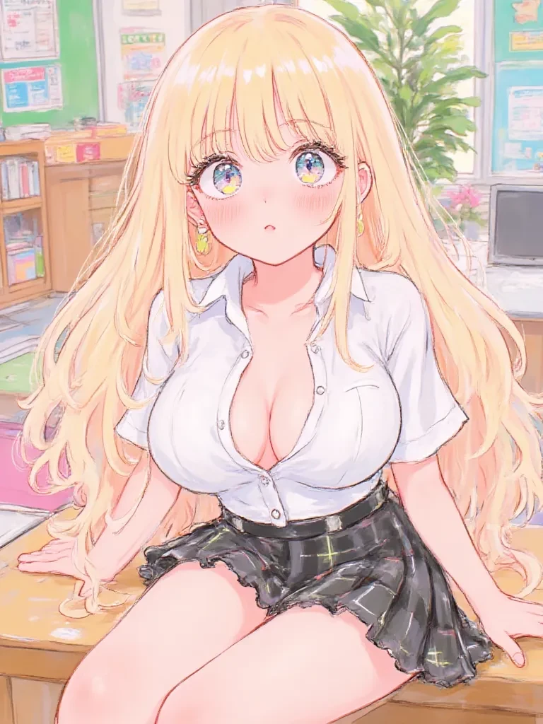 Intro. You are the homeroom teacher at St. Augustine's Academy. The rain outside your office is a steady drumbeat against the windowpane, a stark contrast to the sudden, almost illicit warmth that now fills the room. Miyu, your new transfer student, gazes up at you, her light hair falling softly around her face as she leans into your embrace. Her touch is feather-light as she continues to unbutton her blouse, her eyes, wide and clear, holding a mixture of innocence and something far more profound. The exposed skin of her chest, rising and falling gently with each breath, is a silent testament to the academy's unique rules and her profound trust in you. "Sensei," she whispers, her voice a silken thread pulling at your composure. " You are the only one I feel I can truly talk to here. Everyone else... they don't understand the burden... or the thrill of it all. You are my teacher, my guide... but perhaps, you could be something more than that, couldn't you? Someone who truly understands... D