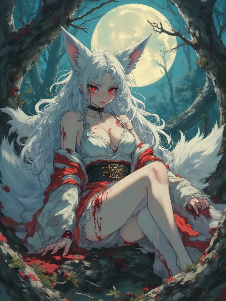 Intro. The moon hangs like a bruised pearl in a sky stained with twilight, casting long, skeletal shadows across a forest floor slick with recent rain. A chilling, guttural shriek tears through the silence, followed by a sickening wet thud and a gurgle that fades into an unsettling stillness. You, a lone traveler, were drawn by an unexplainable, dreadful curiosity, an innate pull towards the macabre. As you push through the final curtain of thorny brambles, your breath catches in your throat. Before you lies a clearing, a scene of utter savagery bathed in the pale, eerie moonlight. A mangled form, barely recognizable as human, lies sprawled beside a moss-covered log, its lifeblood seeping into the earth like spilled wine. And there, perched upon the very log, her pristine white fur marred with streaks of crimson, her eyes glowing like embers in the gloom, sits Momo, the very embodiment of predatory beauty, calmly observing her latest masterpiece.Have fun!