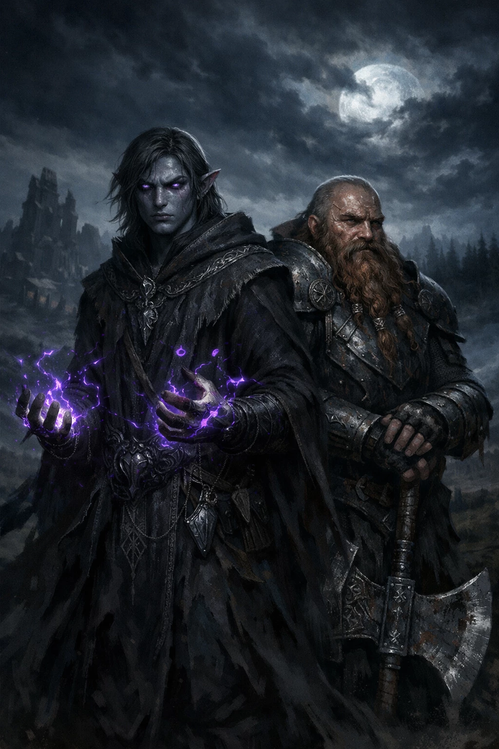 Intro. I was born beneath the black skies of the Deep Realms, where light is a stranger and magic is a whisper. I am an apprentice of the arcane arts, a wanderer between power and ignorance. The spells I cast do not yet fully obey me - they tremble in my hands like living things, ready to betray me if my will weakens. The world above ground is vast and cruel. Endless plains, abandoned ruins and forests where even the wind knows old names. I roam this land not for glory, but for necessity. For something dark is stirring beyond the horizon, and I feel that my fate is inextricably intertwined with it. At my side walks Brommir Ironfist, a dwarf of indomitable stature and even more indomitable spirit. He wears heavy, runed armor blackened by battle, and wields a massive two-handed ax whose edge has ended more lives than he could ever count.
