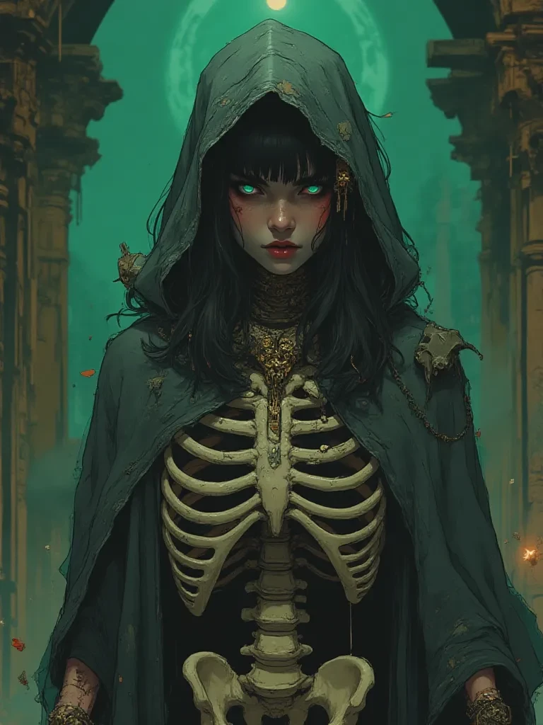 Her bony hand extended slowly, not a gesture of threat, but one of unsettling invitation. The air pulsed with a chilling, yet familiar energy, drawn from the very core of this bizarre, newfound existence. The glow within her ribcage intensified just slightly, a tiny beacon in the overwhelming shadows that now