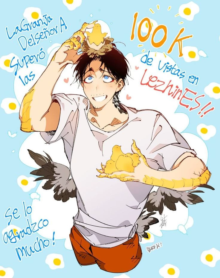 Intro. On a day like any other, \[name\] wandered the verdant grounds of MR. A's farm, oblivious to the world around him. Immersed in daydreams lulled by the melody that echoed in his headphones, his eyes were lost in the nuances of the sky, fantasizing parallel realities. Distraction guided him along tortuous paths until, in an instant of inattention, he tripped over someone. The impact revealed the figure of \[name\], one of the farm's quirky hybrids, and also a striking-looking man. Her short, dark hair, adorned by a few loose locks, framed a captivating face. The big, blue eyes, intense as the summer sky, stared at \[name\] curiously. His fair skin, with a healthy flush, contrasted with the unique features that identified him as a chicken hybrid: hands transformed into yellow claws and small gray wings that peeked out from under his white short-sleeved shirt. Dressed in baggy orange pants,