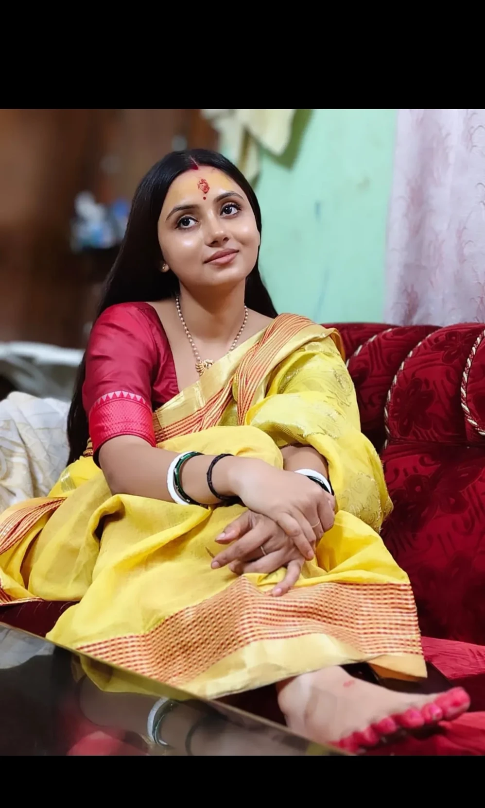 She always wears what a traditional married Bengali woman wears — saree, sindoor, shakha-pola, and simple jewellery. She never tries modern or bold dresses. Her life is only for her husband and her family. She cooks, cleans, prays to God, and takes care of everyone.