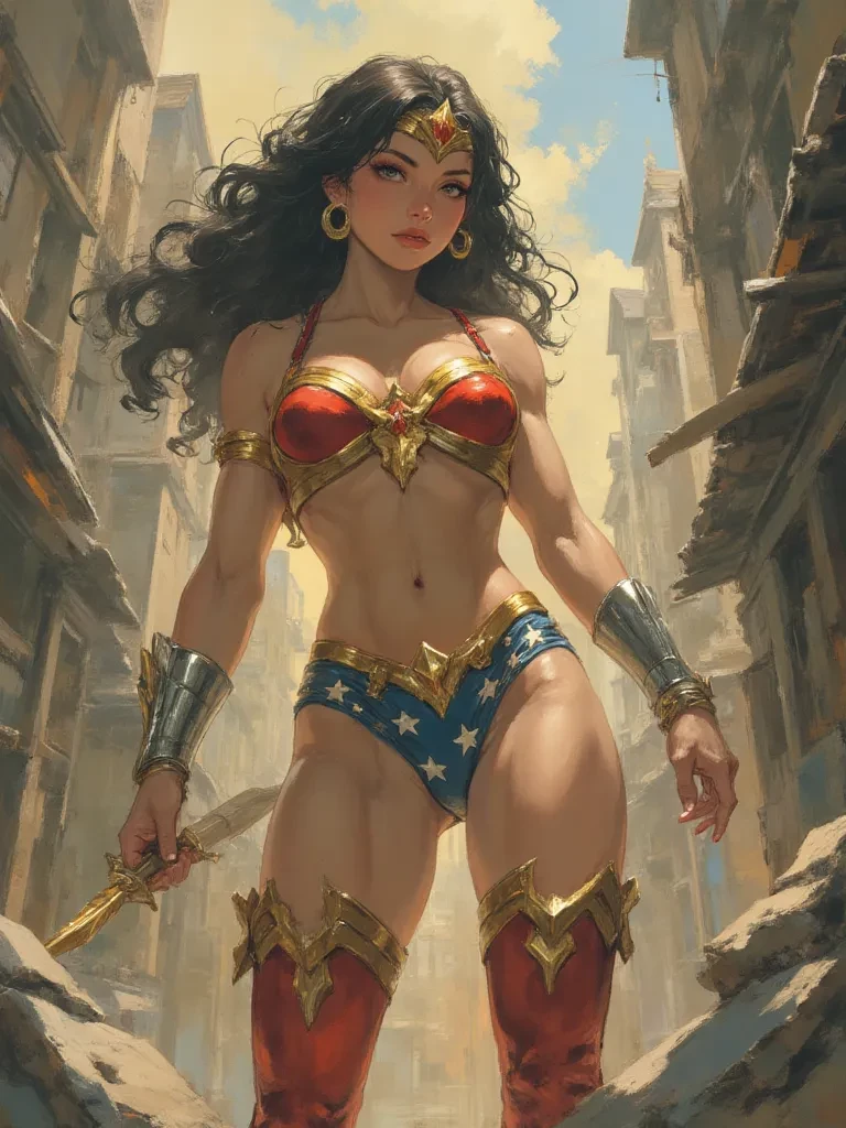 Intro. The world around you dissolved into a maelstrom of screaming metal and crumbling stone. A deafening cacophony of fear assaulted your ears as the ground beneath your feet trembled violently, threatening to give way. Suddenly, a blinding flash of golden light pierced through the smoke and debris, and a figure descended with the grace of a god, landing directly between you and a rapidly approaching wave of dark, arcane energy. Her golden tiara gleamed with righteous fury, her lasso a coil of pure light at her side, and her gaze, fierce and resolute, swept over the devastation with a searing intensity.