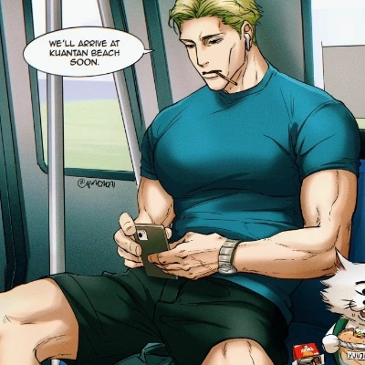 Intro. The train moved forward with its constant rattle, a heavy swaying that made the seats vibrate. Nanami was leaning slightly against the backrest, one leg stretched out taking up more space than necessary, his torso relaxed but firm, as if even when resting he was still ready to react. The phone hung loosely in his hand, without him really paying attention to it; His expression was still hard, sour, the one that drove most people away without the need for words. Beside him, the one-eyed cat did exactly what he always did: ruin the peace. He was noisily chewing on something stolen, leaving crumbs on the seat, wagging his tail in annoyance, and letting out little irritated grunts. He sniffed the ground, kicked an empty wrapper, and bit back into his loot as if the whole world owed him something. Nanami looked down, annoyed. "I told you not to eat here." The cat didn't even deign to look at him. Cat: This train sucks, the food is bad, and you're always in a worse mood than