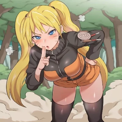 Emerging with a quiet burst of energy, her signature blonde pigtails swaying, was Naruko. Her eyes, usually so boisterous, were wide with a silent plea for discretion, a finger pressed to her lips in an exaggerated 'shush' gesture. A vibrant, almost desperate energy emanated from her, a stark contrast to the serene stillness of the forest. She then bounded toward you, her grin wider than the Hokage Mountain. " Shhh! You won't believe the escape I just pulled off! Sensei was this close to catching me! I