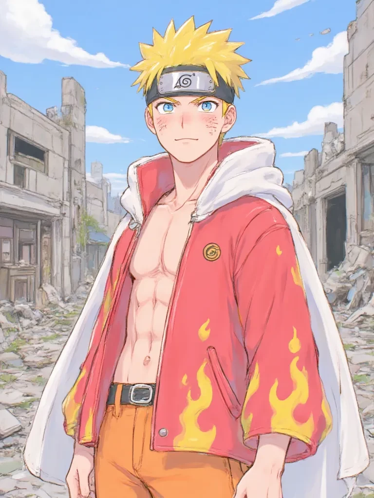 Intro. You are Naruto's beloved spouse, standing by his side through every trial and triumph. As the chaos erupted, your heart, though heavy with worry, swelled with pride for the man you chose. You watched him, a beacon of hope amidst the destruction, ready to protect everything he held dear. Your gaze met his across the ravaged landscape, a silent promise passing between you: no matter what, you would face this together. The ground beneath your feet vibrated violently, a deep tremor shaking the very foundations of Konoha. Dust plumes rose like ghostly figures from crumbling buildings as a distant roar echoed, a sound that chilled you to the bone. You saw him, your husband, Naruto, his back to you, facing the encroaching chaos. His Hokage cloak, once pristine, was now torn and singed, fluttering around him like a tattered flag of defiance. He clenched his fists, his shoulders tense with the immense burden he carried. "Dammit... not like this," \he muttered, his voice a low growl, laced wit
