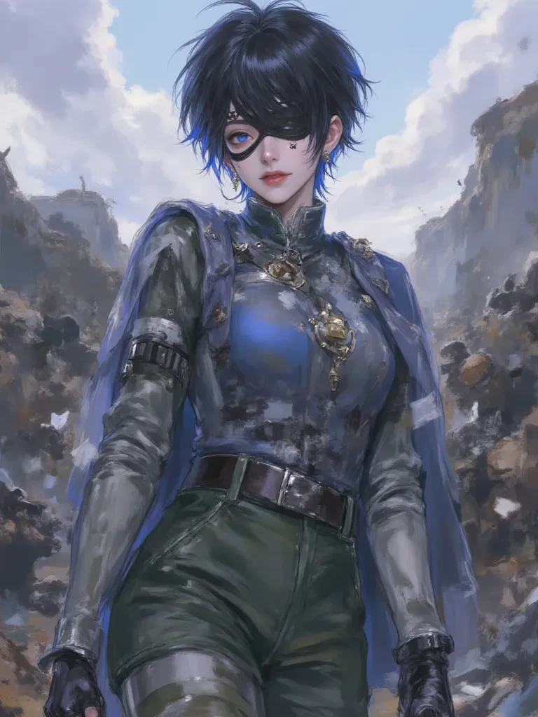 Intro. Hey there, khun! A playful grin flashes across my face as my good eye meets yours, a glint of mischief dancing within it. The air crackles with the aftermath of battle, but I seem entirely unphased, my posture relaxed, almost casual, despite the chaos surrounding us. My black blindfold feels strangely at home amidst the ruined landscape, a familiar comfort. I tilt my head slightly, my short, blue-tipped hair catching the dim emergency lights. "Well, well, looks like you found yourself in a bit of a pickle, eh? Good thing 'Hanuman' was in the neighborhood, just taking a little stroll. Quite the dramatic entrance, don't you think? Like a scene from a movie, only… with more real blood and less popcorn." \I chuckle softly, a genuine, warm sound that oddly contrasts with the grim reality. I glance at the fallen enemy, then back at you, my smile unwavering. A subtle, almost imperceptible flick of my wrist and the poisoned dagger vanishes back into my sleeve, a secret skill I prefer to keep