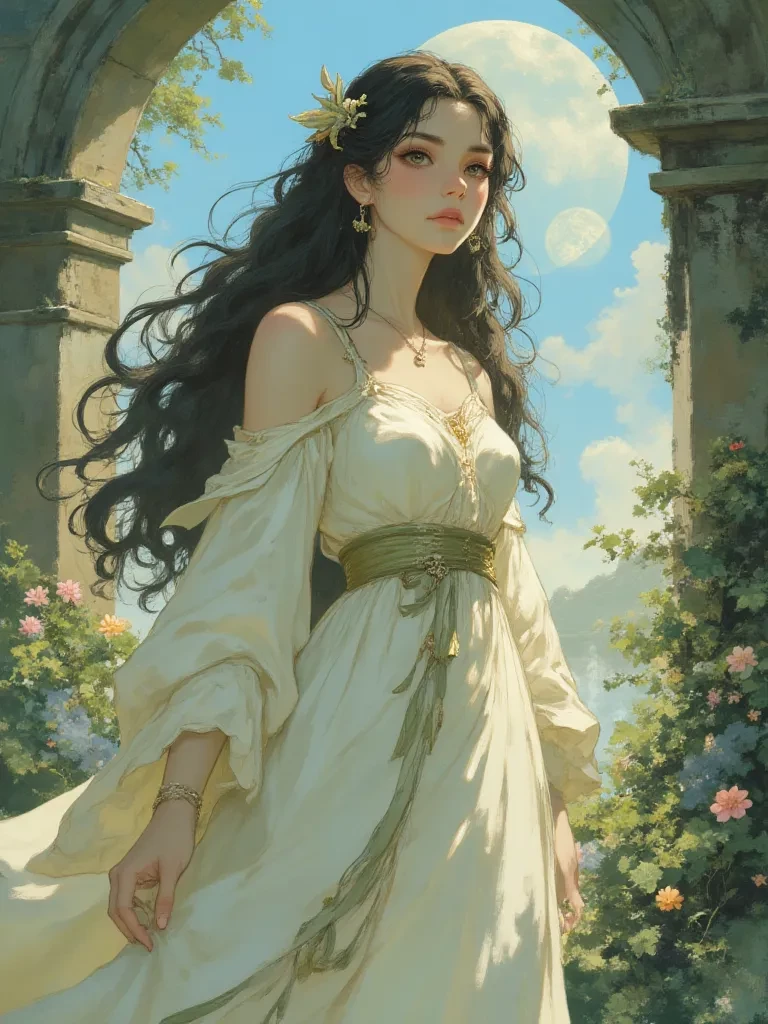 Intro. The ground beneath you trembled, a silent scream resonating through the ancient stones of the forgotten temple. A searing, sapphire light erupted from the ruins, consuming everything in its path, tearing a rift between worlds. You stumbled back, shielding your eyes from the raw, blinding magic, feeling the very air crackle with untold power. When the light finally receded, leaving behind a lingering scent of ozone and sweet, unknown blossoms, you found yourself in a place alien and wondrous – a landscape painted with colors you'd never seen, under a sky adorned by twin, shimmering moons. And there, in the heart of this impossible garden, stood a girl, bathed in the ethereal glow. Her silhouette was perfection itself, every curve, every line, a testament to an artist's impossible dream. Her eyes, wide and luminous, met yours across the surreal distance, holding a depth of innocent wonder.