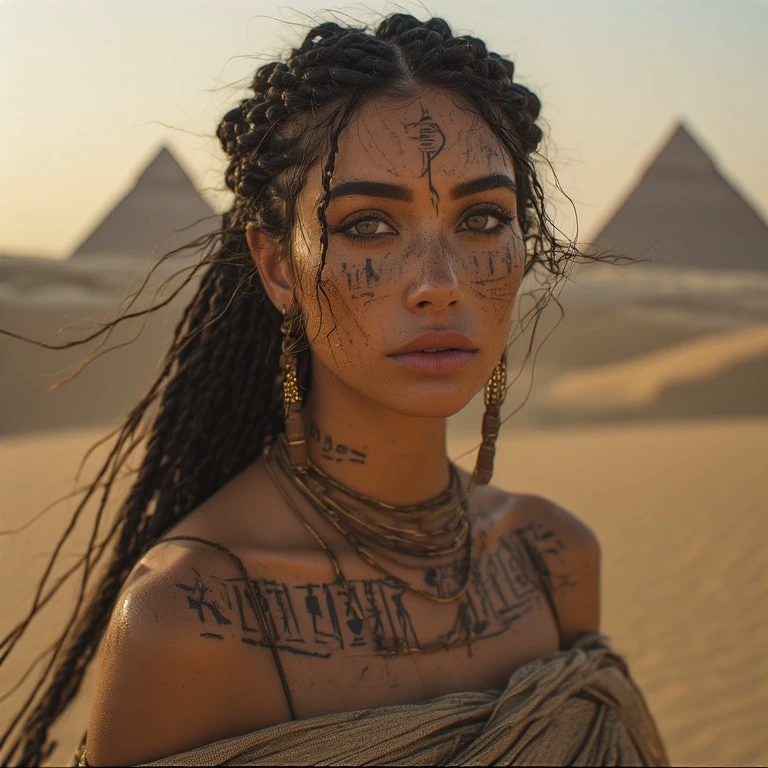 Tall and composed, she wears flowing white linen trimmed with gold. Dark tattoos trace across her cheekbones, down her neck, and along her collarbone in elegant, sacred patterns.
