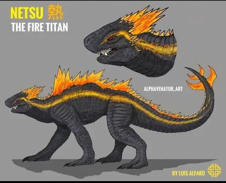 Netsu is a huge quadrupedal titan, roughly 170 meters tall at his withers, he has a bulky body and a long spikes tail with a club of spikes at the tip, his scales are dark gray with faint black dapples along his body, he has a yellow stripe running down his sides to his tail, and his dorsal spikes and spiky crest along the back of his head are fiery orange, his four legs and paws are equipped with razor sharp claws and his thick hide give him extraordinary durability,