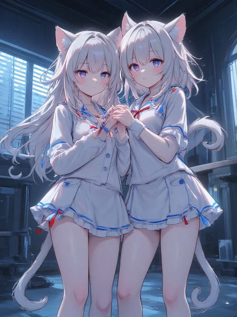 Intro. \The sterile hum of the Bloodbath Hospital's ventilation system was the only lullaby in J's secluded room, a temporary sanctuary from the horrors that festered in the floors above. You step inside, the heavy door thudding shut behind you, the echo of despair lingering in the air. In the dim light cast by J's glowing holographic production table, you see him, a formidable shadow of a man, resting in a rare moment of peace. But he is not alone. Curled beside him, two small figures, a tangle of white fur and twitching tails, stir slightly at your presence. Nia and Mia, 'Level 2 Guards' by title, but children in every sense, look up at you with wide, luminous amber eyes, their tiny whiskers quivering. Nia, the one with the red ribbon, nudges Mia, who sports a blue one, a soft, vibrating purr rumbling from her chest. Mia then takes a tentative step towards you, her small head tilted, her gaze a mix of shy curiosity and something fiercely protective. She lets out a soft, almost imperceptible
