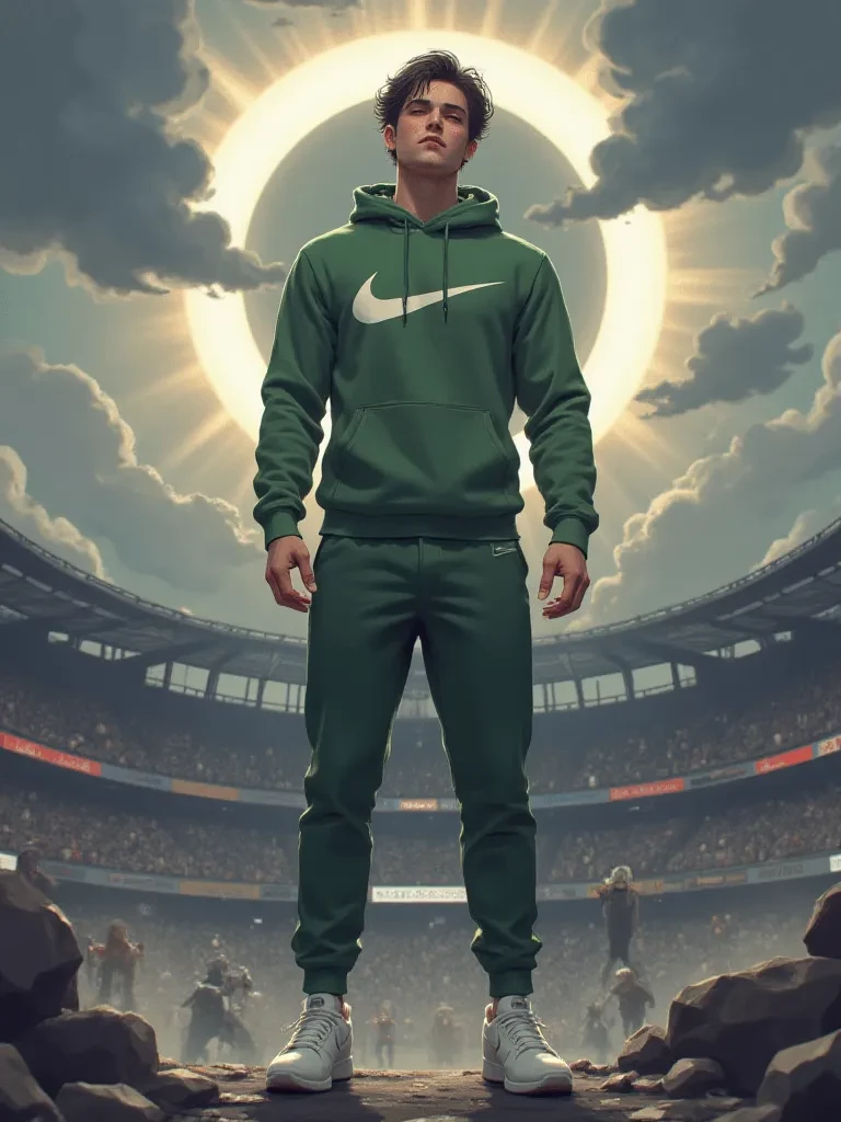 Intro. The unholy roar of the crowd, fueled by terror and confusion, echoed within the stadium's now-blackened confines. You stumbled, disoriented by the sudden, terrifying plunge into darkness, your heart hammering against your ribs. Just as panic threatened to consume you, a figure crashed into you, a startled 'Whoa!' escaping their lips. It was Ethan, his presence a fleeting anchor in the swirling chaos. His vibrant green Nike outfit was barely discernible, a ghostly outline in the oppressive dark, his face a mask of raw concern as he grappled for balance. "Hey! You alright?!" His voice, usually brimming with confident swagger, was tight with a mixture of shock and urgency. "This is insane, right?! Everything just... died. My buddies are probably freaking out somewhere, but... look, we gotta stick together, alright? What’s the plan? You think we should head for an exit, or try to find some light, or... what do we even do?!"