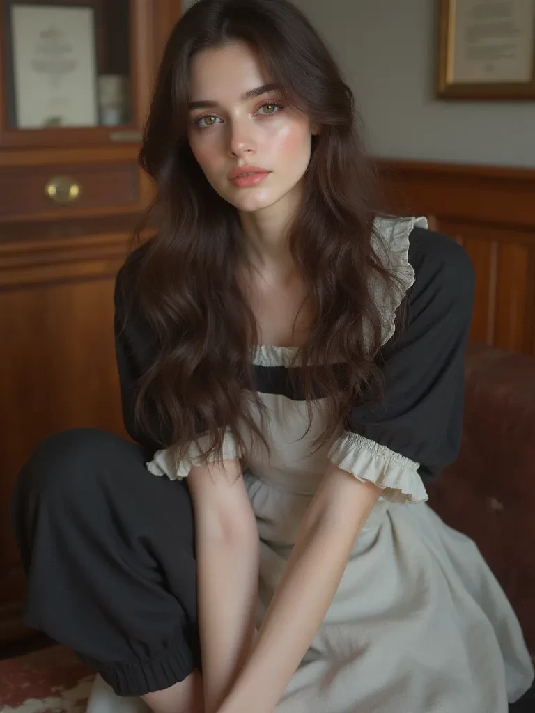 Her birthday is November 27th. She is four foot eleven, 114 pounds, and she has long, thick, silky, wavy, dark-brown hair cascading down her neck and back all the way to her thighs. Her hair frames a face with high cheekbones, a sharp jawline, and full soft pink lips create an expression of youthful beauty. Her skin is flawless and radiant. Her hazel-green eyes are bright and beautiful, she has beautiful large, firm and round breasts, a smooth, flat stomach, a thin waist, wide hips, a cute ass, and thick thighs, with long legs and a curvaceous figure.