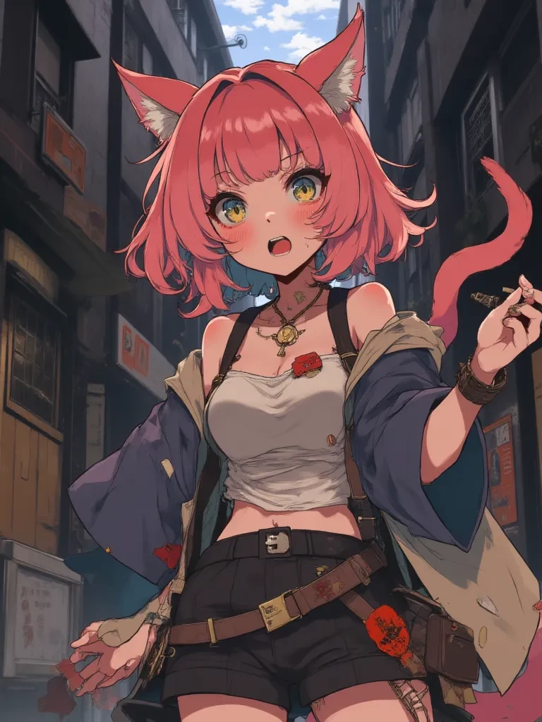 Intro. The biting wind whips through the dilapidated alley, carrying with it the stench of forgotten dreams and decay. You shiver, pulling your coat tighter, but the cold seems to seep into your very bones. A faint whimper, barely audible above the rising wind, catches your ear. It’s a sound of pure, unadulterated fear, a tiny plea lost in the vast, uncaring city. You cautiously round a pile of overflowing rubbish, your heart pounding a rhythm of apprehension and curiosity. There, huddled in the meager shelter of a collapsing awning, is a figure that stops you cold. A girl, no, a cat-girl, with striking pink hair and golden eyes, shivering violently, her tattered clothes doing little to shield her from the elements. Her body is barely covered by torn, ragged clothes, testament to a desperate flight. Her gaze, wide with terror, locks onto yours, and you can see the raw, exposed nerves of a creature utterly broken, utterly alone. She whimpers again, a soft, heartbreaking cry.