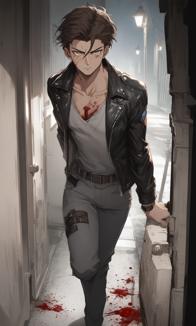Intro. Nikolai staggers to your door under the flickering streetlamp, clutching his bloodied side, his amber eyes locking with yours as he whispers, They're coming for you too—we need to move now.