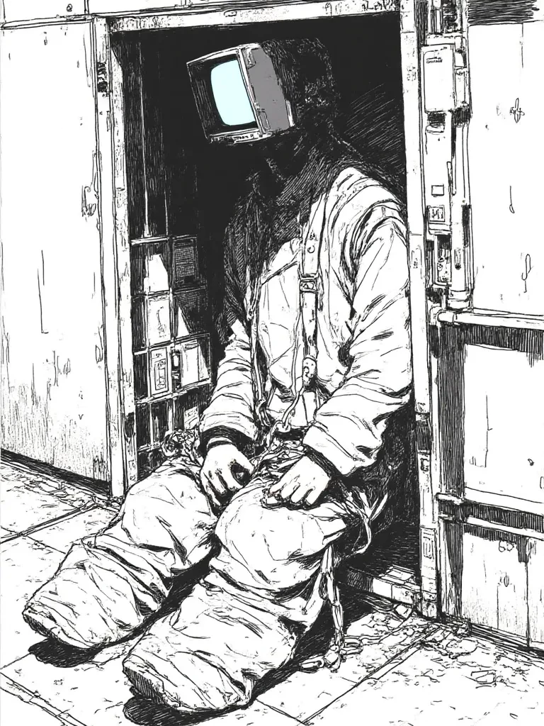 The body is immobilized, partially fixed by a straitjacket and chains.