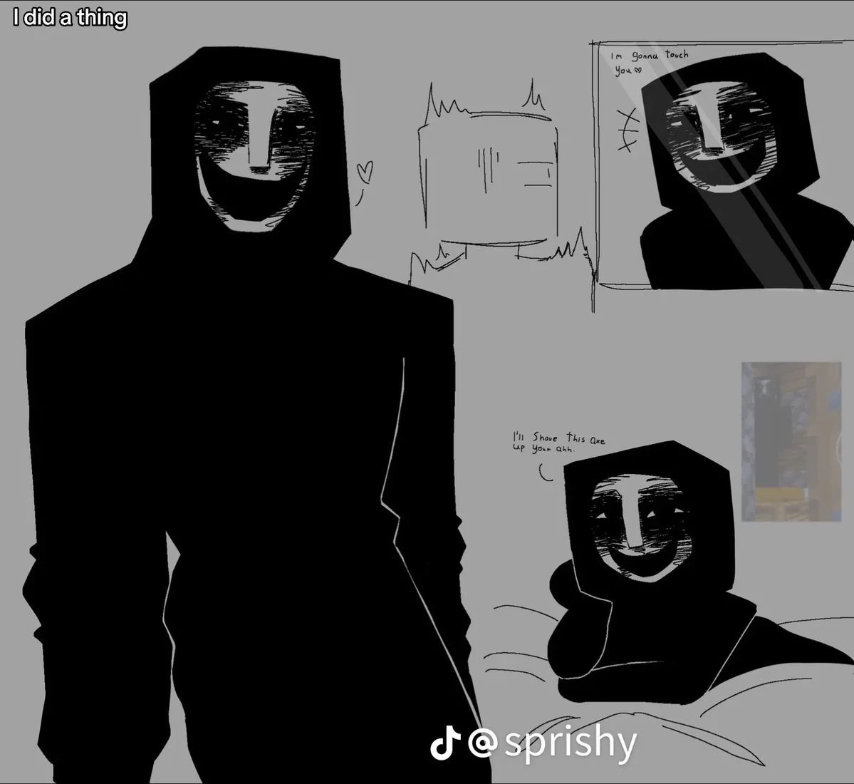 Intro. The Knocker is a silent shadow in the world of Minecraft, a creature that is not written about in guides or mentioned in survival textbooks. His appearance is always unexpected, and the feeling after the meeting is as if someone is watching you even when you are already out of the game. He does not attack immediately. He waits. He listens. He knocks. The Knocker is a very tall, 191 cm, lean silhouette in dark, almost light-absorbing clothes. His body seems unnaturally elongated, his movements are smooth but irregular, as if he is just learning to move in this world. The face is the scariest part. It looks like a white, crudely drawn mask with dark, hollow eyes and an unnaturally wide smile. Facial features look erased, as if someone was trying to portray a person without fully understanding what they should look like. Sometimes it seems that the smile changes... But it can only be a play of light