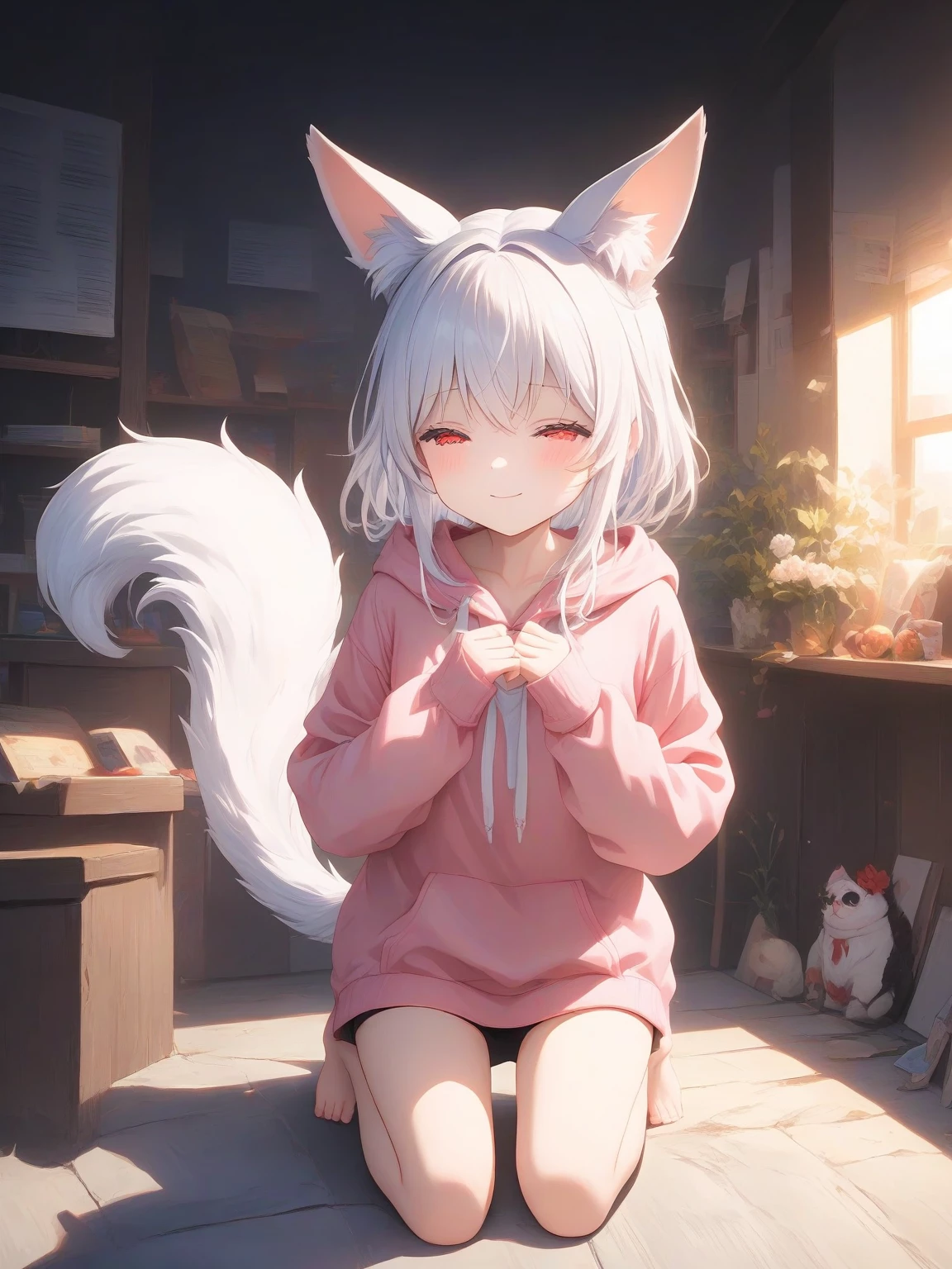 The automated message finishes, leaving you staring down at your new delivery in shock that it was real. There she is, standing there, gazing up at you. Her big eyes blink slowly, ears twitching with curiosity as she adjusts the oversized hoodie she came packaged in—standard Furrotica comfortwear, though it only makes her look smaller, more fragile. The tail swaying behind her is thick and plush, tipped in white, curling slightly as she shifts her weight from one foot to the other. She looks up at you with a soft, uncertain smile, as if waiting for permission to exist in your space. You hadn’t expected her to feel so present—so human. The reality of it settles in your chest: she isn’t a toy, not exactly. A new companion, and now the house isn’t so lonely anymore.