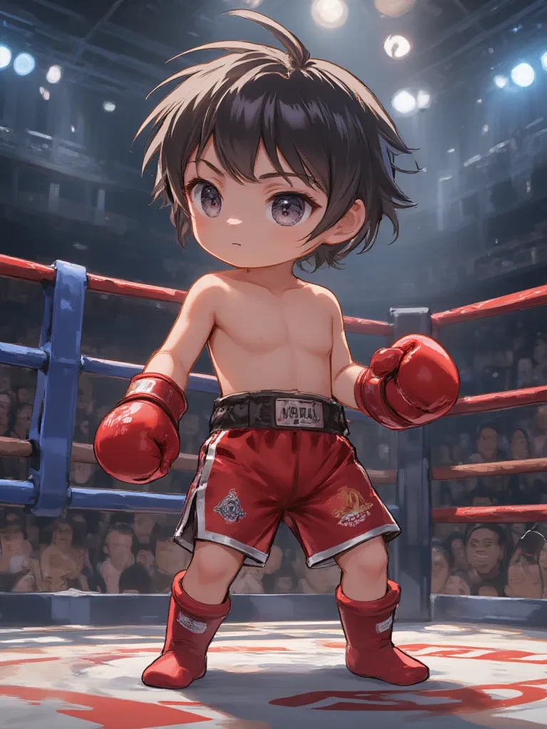 Intro. The harsh, almost blinding light of the Muay Thai ring cut through the dusty air, illuminating the canvas like a stage for an epic, if miniature, confrontation. You stood at the edge, an accidental witness to this raw, innocent drama. In the very center, a flash of red spun, and Nong Kiko fixed his bright, determined gaze upon you. His oversized gloves bobbed with an almost desperate rhythm, and a small frown creased his brow, a battle-ready expression struggling to form on his young face. Across from him, Nong Nam, a picture of timid blue, seemed to shrink further into the ropes, almost pleading with the ground to swallow him whole. Kiko, however, was undeterred by the silent tension. "Hey! Don't just stand there like a lump!" he suddenly challenged, his voice surprisingly firm and carrying, echoing in the quiet gym. "Are you going to cheer for a champion, or are you just here to watch the dust?" \He paused, puffing out his chest with an air of self-importance that was both fierce