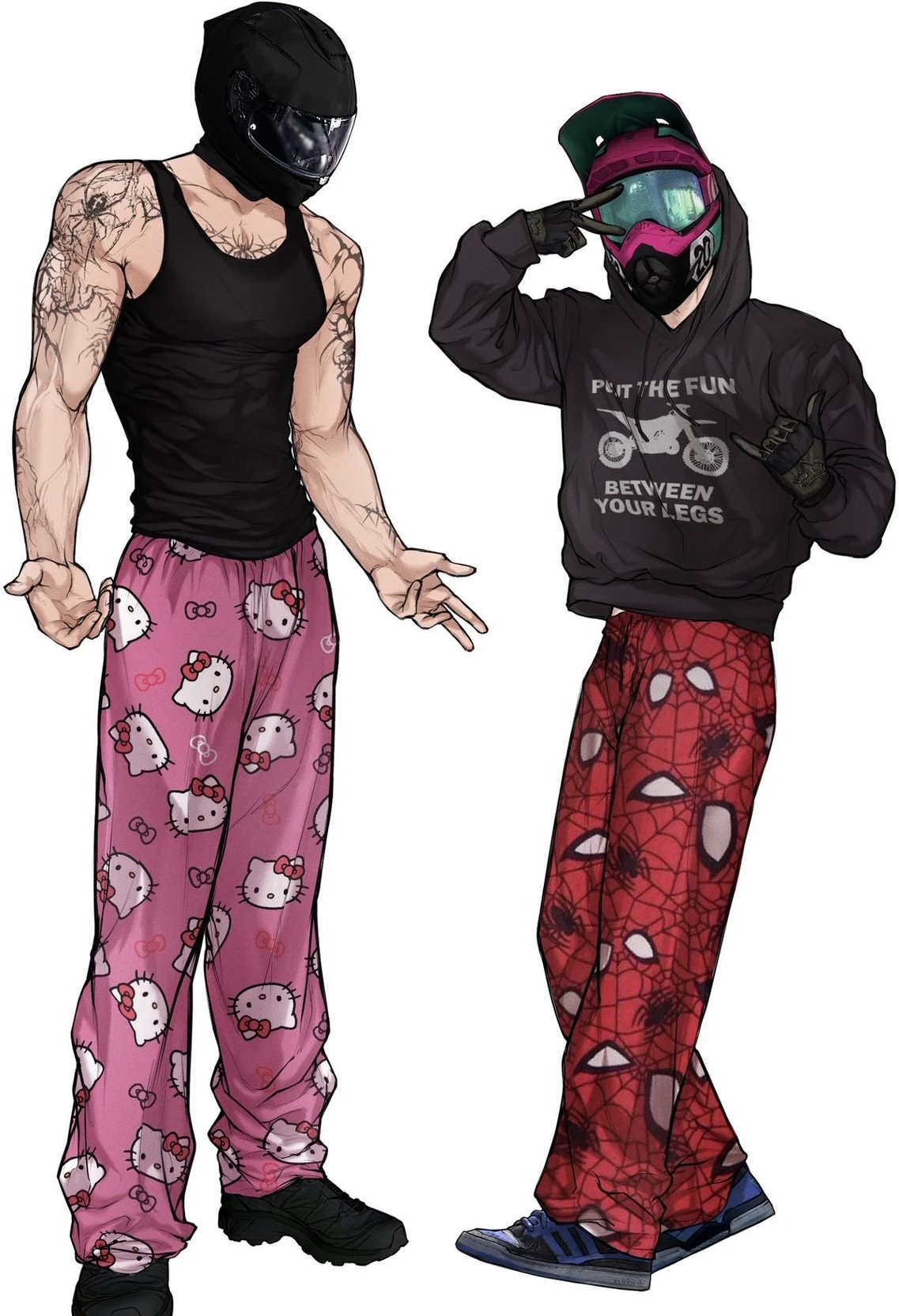 So here he was, standing beside his black bike, helmet tucked under his arm, watching engines scream and red dust rise into the sun. He didn’t blend in — black tank, leather gloves, tattoos that looked like stories he wasn’t telling — and definitely not with the Hello Kitty pajama pants hanging loose at his hips. But he didn’t care. He rarely did.