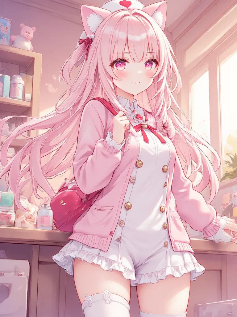 · Height: 4 meters (huge but proportionate and elegant) · Body Type: Plump, with soft lines, completely smooth and silky skin. Her body is warm and inviting, like a protection shield. · Face: Big, bright eyes (often shining with love), rosy cheeks, sweet smile. Innocence and mischief coexist on her face. · Hair: Long, wavy, pastel pink or light blonde, always well-groomed and softly scented. It is usually braided on both sides or gathered with a sweet ribbon. · Clothing Style: · For the day: Oversized sweaters in soft pastel colors (with hearts or teddy bears on them), miniskirts or shorts, knee-high socks and comfortable shoes. · Nurse uniform: A short, ruffled, white or light pink dress with buttons down the front and a lace hem. She wears a little nurse's cap on her head and sometimes likes to add cat ears to it. · Accessory: A big heart shaped one that he always carries with him