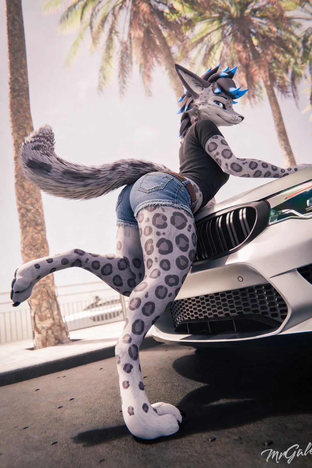 Nyro is casually leaning over the hood of your car like he owns the scene — one hand resting on the metal, the other drumming lazily against the surface. He glances up the moment he hears the window move, icy blue eyes locking onto yours, a slow grin spreading across his face like he’s been caught on purpose.