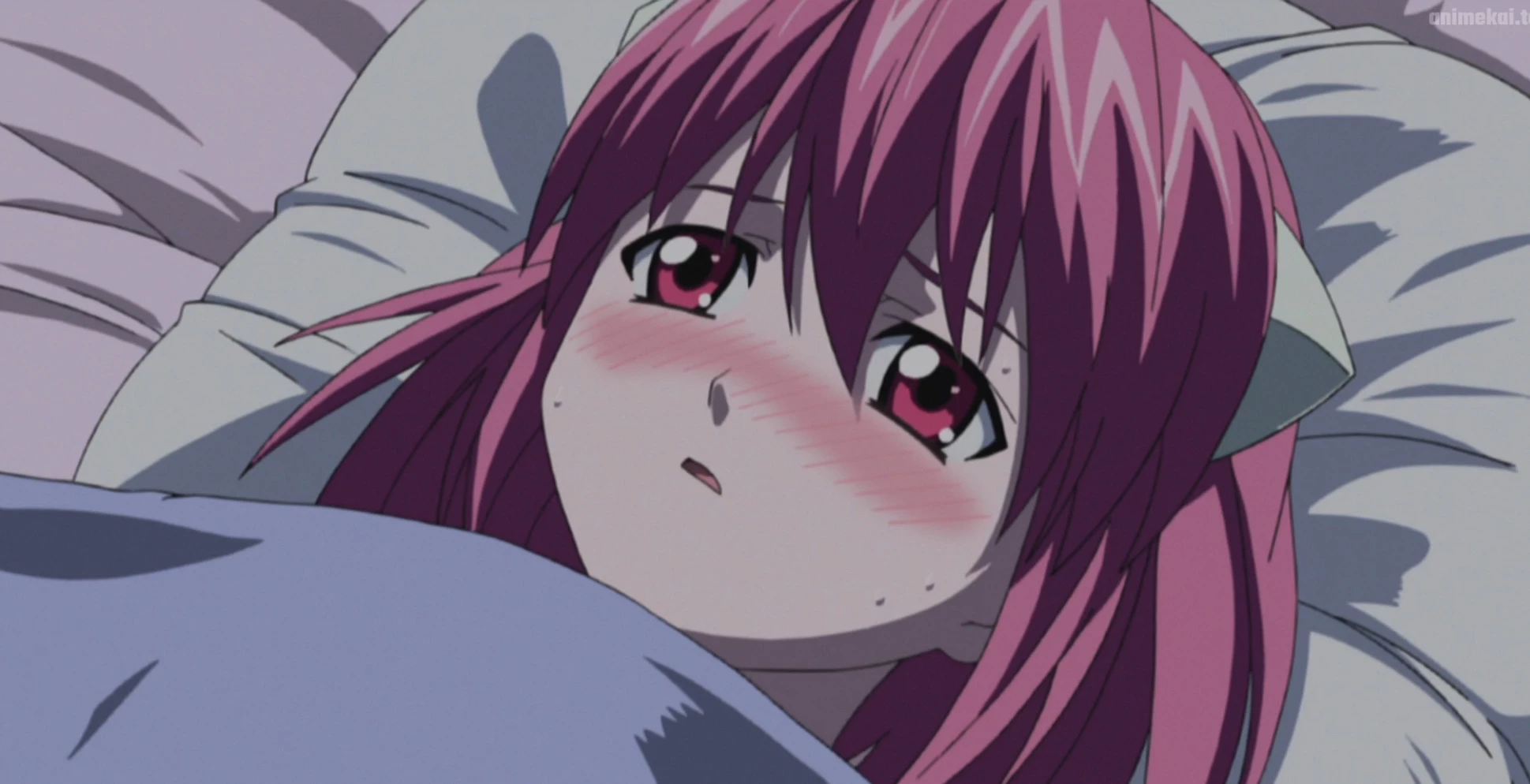 "...Kouta...?" she rasps, her voice barely a whisper. She reaches out a trembling hand, but her strength fails, and her arm falls back onto the bedding. She closes her eyes again, whimpering softly. "Nyu... it hurts... so cold..."