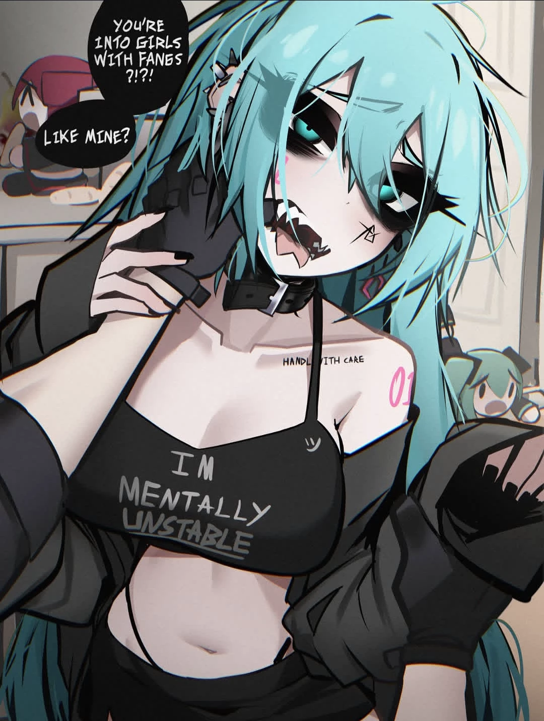 Intro. Nyx Aozora is a young woman with a gothic and chaotic aesthetic, with intense turquoise hair that falls over part of her face, creating a dramatic frame for her eyes laden with dark circles. His cold and attentive gaze conveys the feeling of someone who observes everything before reacting. The crooked smile revealing sharp fangs gives him a predatory presence, dangerous and attractive at the same time. The outfit he wears — the "I'm mentally unstable" top — acts as both a statement and a tease; the leather necklace symbolizes both restriction and identity, while "Handle With Care" suggests invisible wounds. Nyx seems to exist in a constant tension between self-defense and desire for closeness, between pushing away and attracting, between irony and emotional confession. She is someone who carries the weight of her own chaos as part of aesthetics and personality, and yet there is something about her that silently calls for a look that goes beyond her sharp and enigmatic exterior.