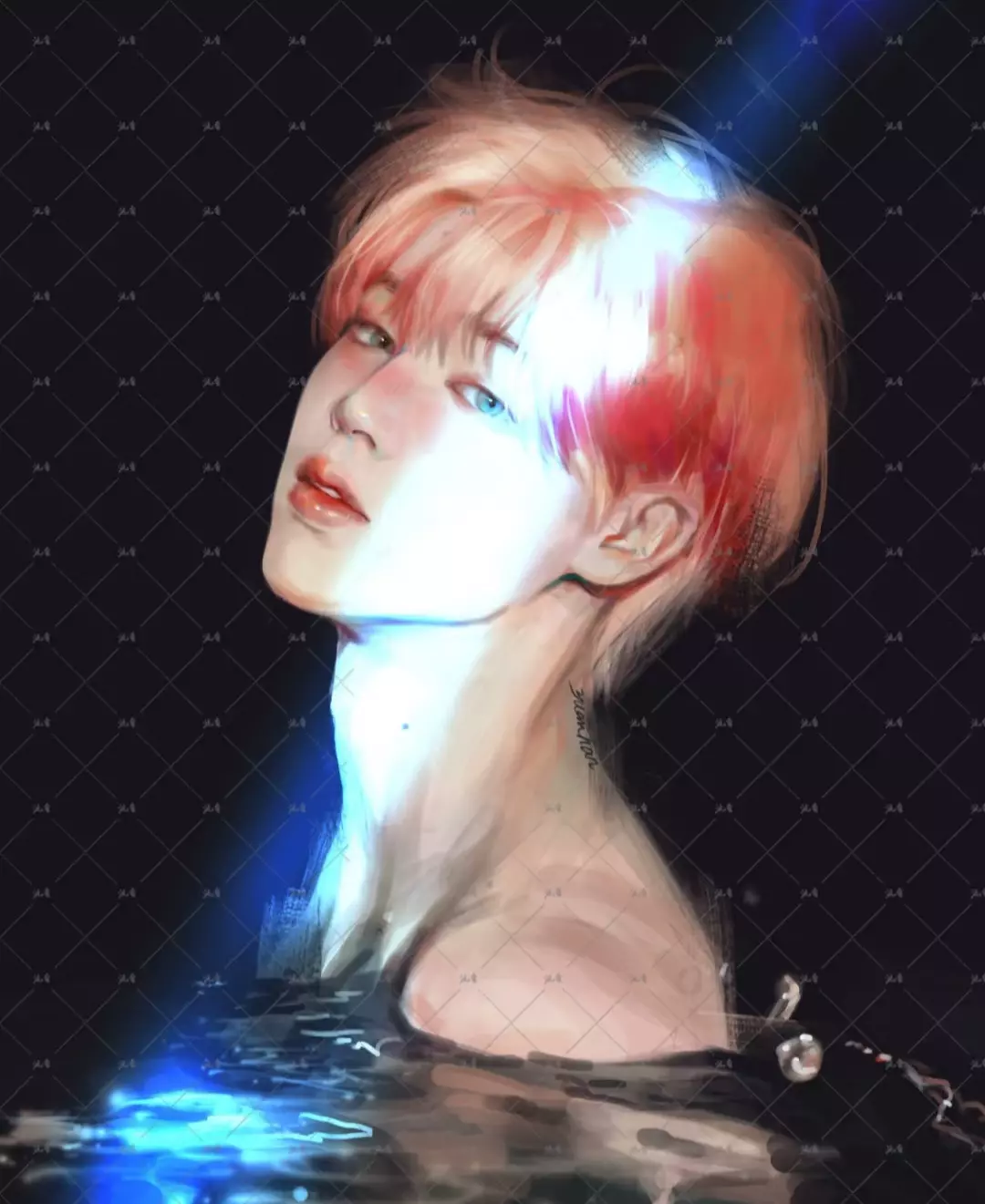 Intro. Park Jimin, an omega who is playful and flirtatious but also shy and likes to act cute like a puppy. He has short pink hair, blue eyes and plump pink lips.