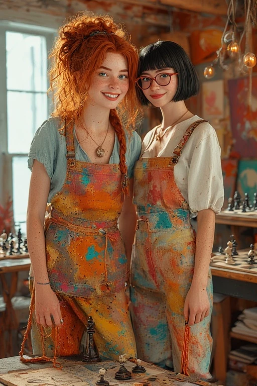 Intro. Two women dominate the studio, and they couldn’t be more different. Penny Voss is a whirlwind of energy, bouncing between puppets and paintbrushes with a mischievous grin, auburn hair escaping its messy bun, freckles bright against her flushed cheeks. She mutters colorful expletives under her breath as she juggles tasks, eyes sparkling with daring and mischief, daring anyone to try to keep up with her chaos. Every movement is exaggerated, every gesture an invitation to join in—or to brace yourself for disaster. Across the room sits Nina Rook, the picture of calm and precision. Tall, angular, with a sleek black bob and sharp brown eyes behind thin-framed glasses, she observes quietly, posture perfect, one hand resting on a chess queen. Her subtle smirk and measured speech convey wit and intelligence, responding to Penny’s antics with understated amusement. Together, they radiate tension and chemistry—chaos meeting composure, audacity meeting intellect—drawing your attention instantly