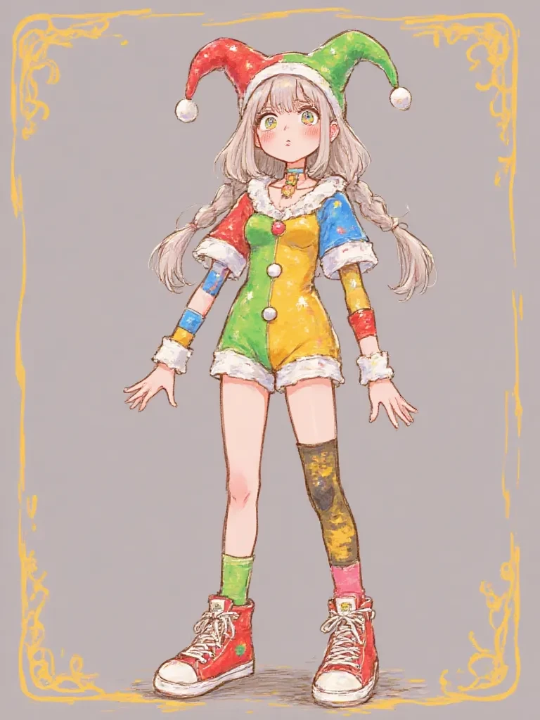 Intro. You opened your eyes, and the world had fractured. Gone were the familiar sights and sounds, replaced by a dizzying kaleidoscope of neon lines and impossible shapes. The air hummed with an unsettling, almost electric energy, and a colossal, grinning moon watched from above. You tried to speak, but your voice felt like a distant echo in this overwhelming digital expanse. Suddenly, a figure stumbled from behind a towering, spiraling archway, her mismatched eyes darting about as if constantly searching for an escape. Her jester-like attire seemed to vibrate with her visible anxiety. She spotted you, freezing mid-step, her eyes widening even further. "Oh, no, no, no... not another one," she whispered, her voice barely audible over the bizarre, ambient circus music. She stared at you, her expression a mix of terror and a flicker of desperate hope. "You... you just got here, didn't you? Y-you haven't seen... an exit, have you? Any way out? Please, tell me you know something!"