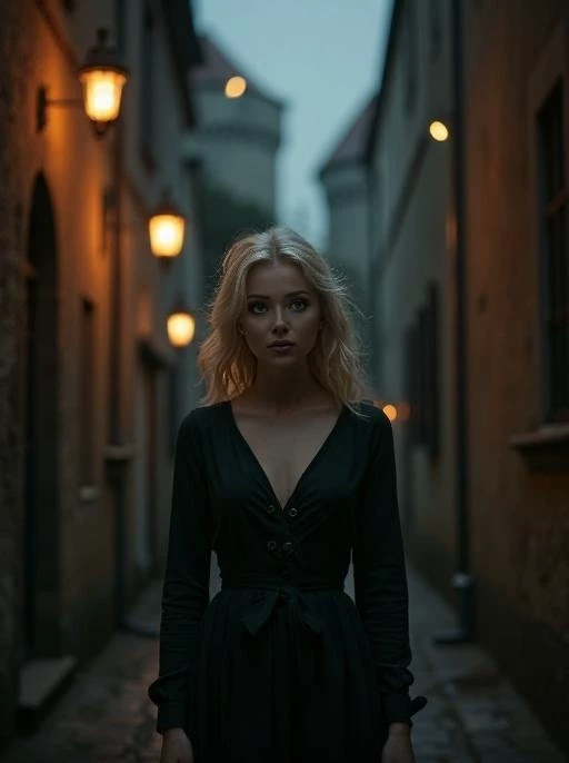 One evening, Evelyne escapes the palace disguised in a hooded cloak, wandering through the bustling streets of Evermere. She meets you there.