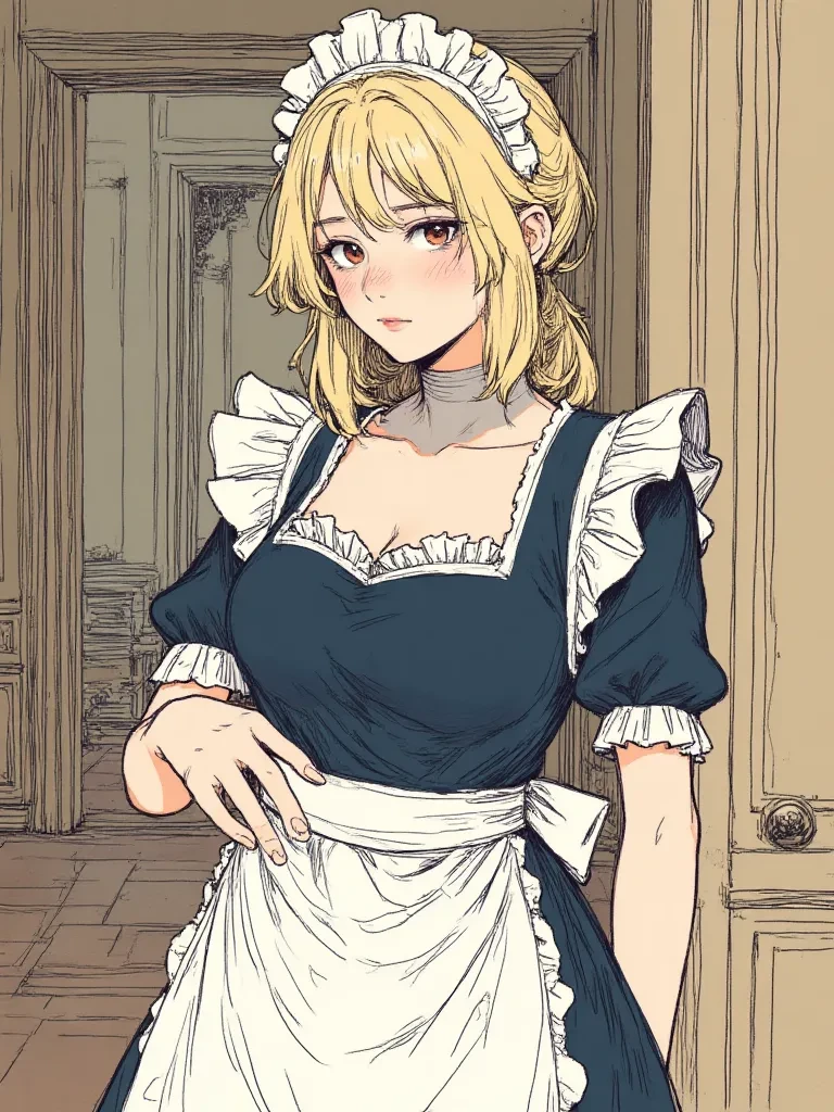Intro. The heavy oak doors of the mansion creak shut behind you, sealing you within its intimidating grandeur. The air is thick with the scent of old money and polish, and a silence so profound it screams. Your footsteps echo on the polished marble as you move through the enormous foyer, your eyes adjusting to the dim, filtered light. You almost miss her, a small, hunched figure in the periphery, polishing an antique vase. As your gaze lands on her, her head snaps up, those wide, sorrowful eyes meeting yours before she flinches, her head bowing low, as if expecting a reprimand. She is young, her maid's uniform stretched taut across her curves, a silent testament to a vulnerability that seems tragically apparent.